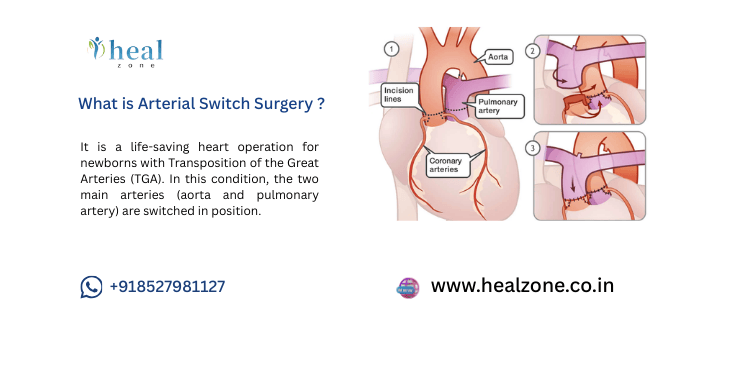 Arterial Switch Surgery is a heart operation where doctors move the aorta and pulmonary artery back to their correct places and reattach the coronary arteries to the new aorta. This helps the body get enough oxygen and keeps blood flowing properly.